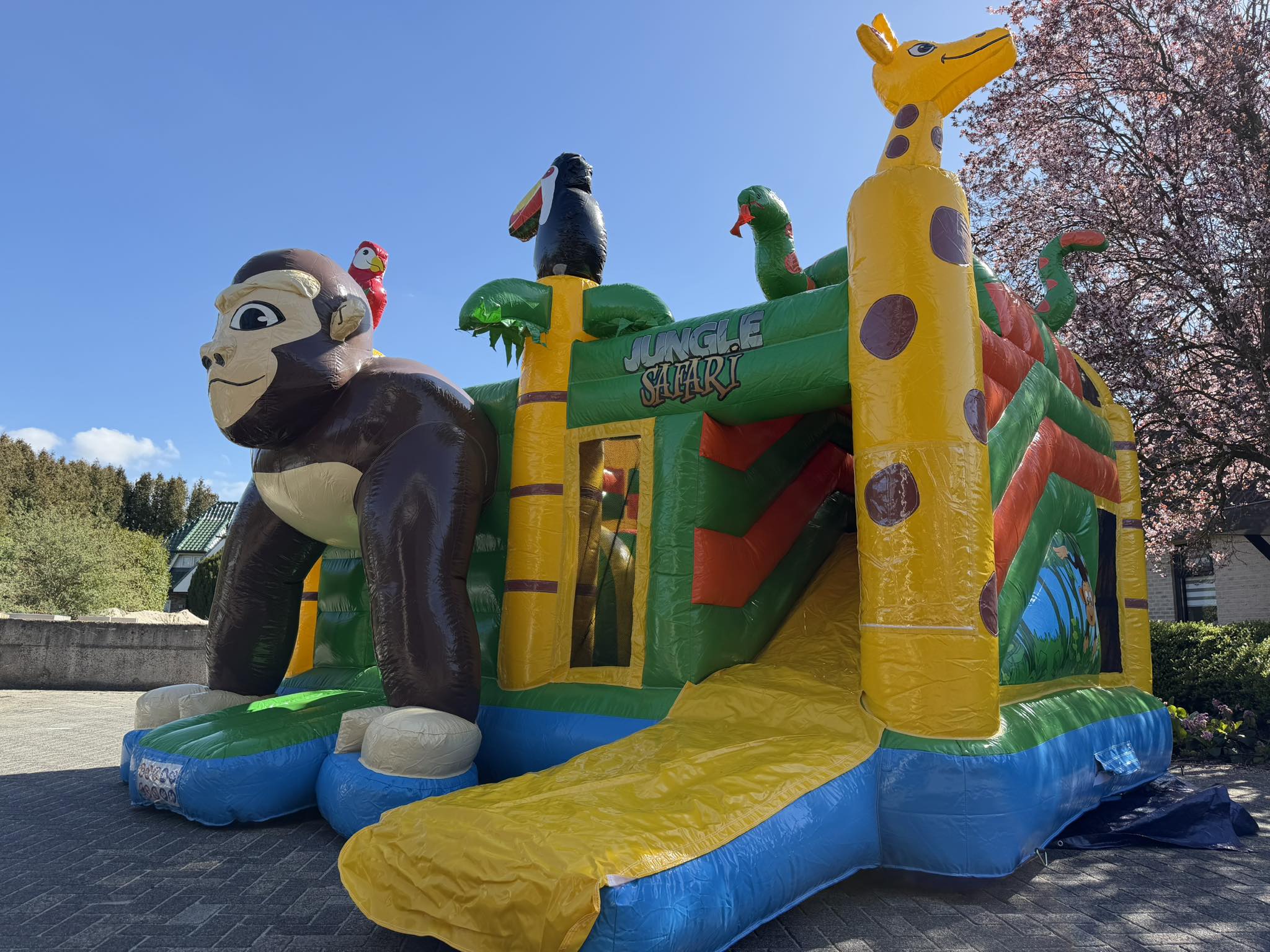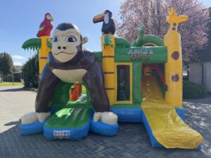 De Multiplay Safari met glijbaan is een kleurrijk springkussen De Multiplay met glijbaan biedt naast springplezier ook veel extra speelmogelijkheden. Het springkussen heeft een ruim springvlak en is voorzien van een glijbaan waar vanaf gegleden kan worden.